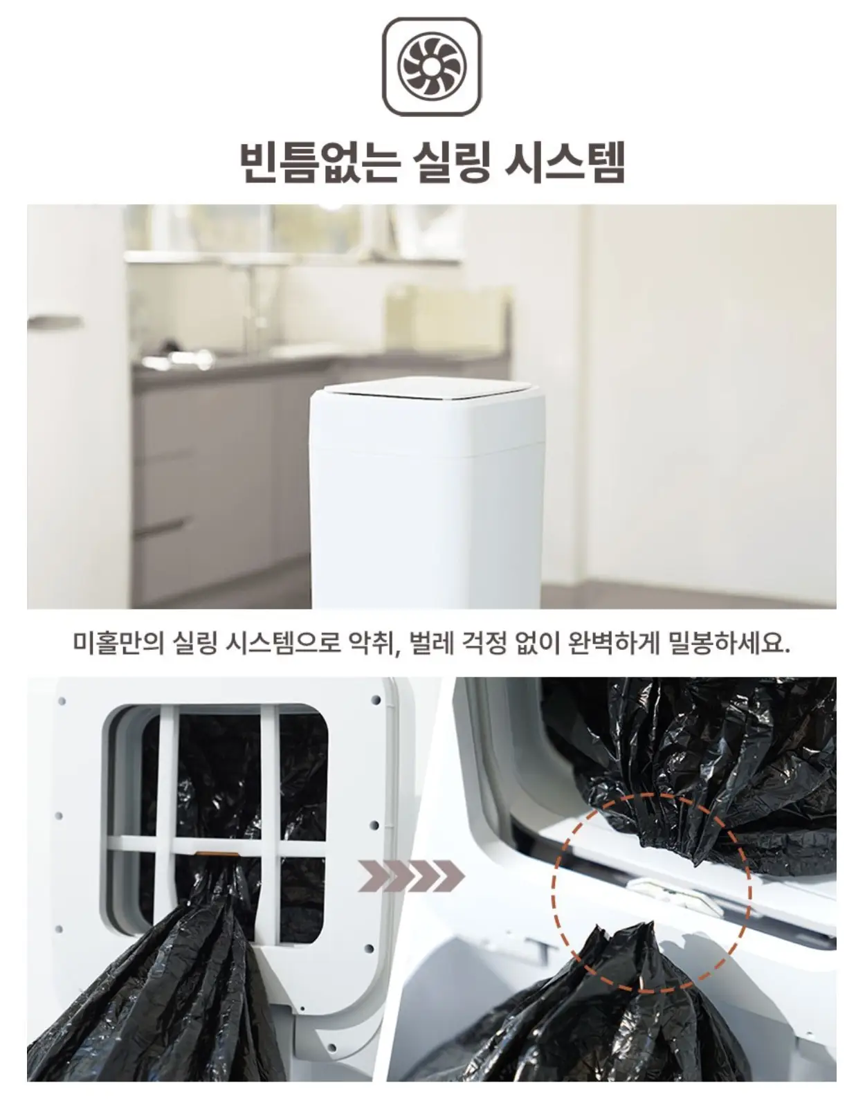 미홀 자동센서 스마트 휴지통은 17L의 넉넉한 용량과 최대 35cm 모션 자동감지모드는 손 없이 쓰레기를 버릴 수 있고 빈틈없는 실링 시스템은 악취, 벌레 걱정 없이 밀봉 후 완벽하게 배출이 가능하죠.